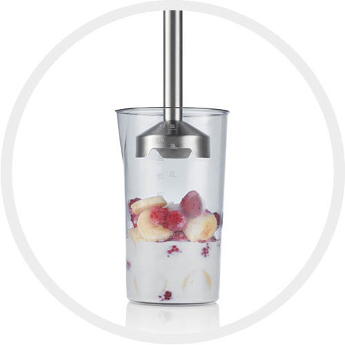 Sebze ve meyveleri kolayca ezip, püre ve ayran yapmaya uygun 800 ml kapasiteli özel ölçü kabına sahiptir.