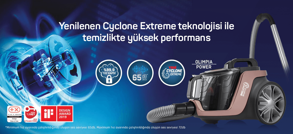 Arzum Olimpia Power, yenilenen Cyclone Extreme teknolojisi sayesinde tozu havadan daha iyi ayırarak daha uzun süreli yüksek emis gücü olusturur.
