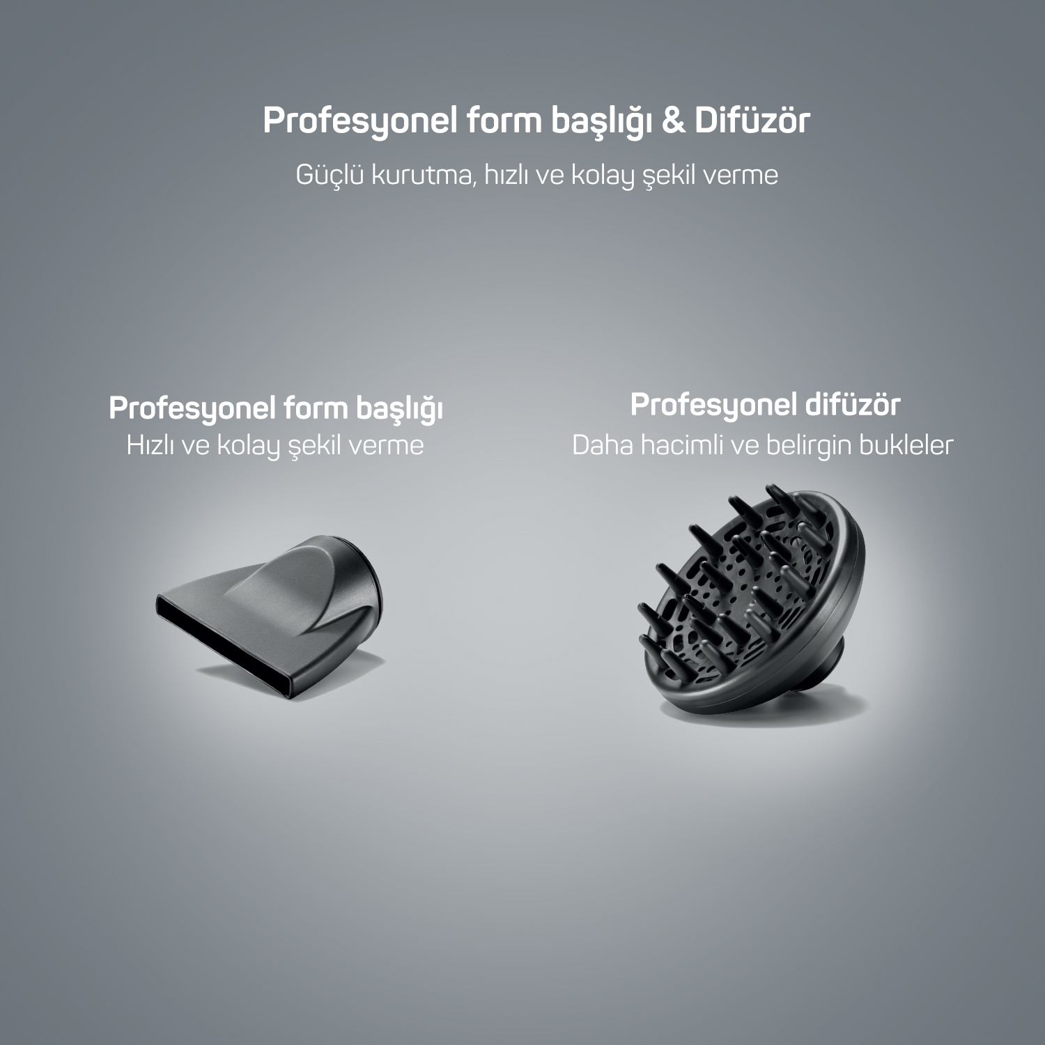 Profesyonel ince form başlığı oluşturduğu maksimum hava üfleme basıncı ile saçlarınızı kolay şekillendirmenize yardımcı olur.