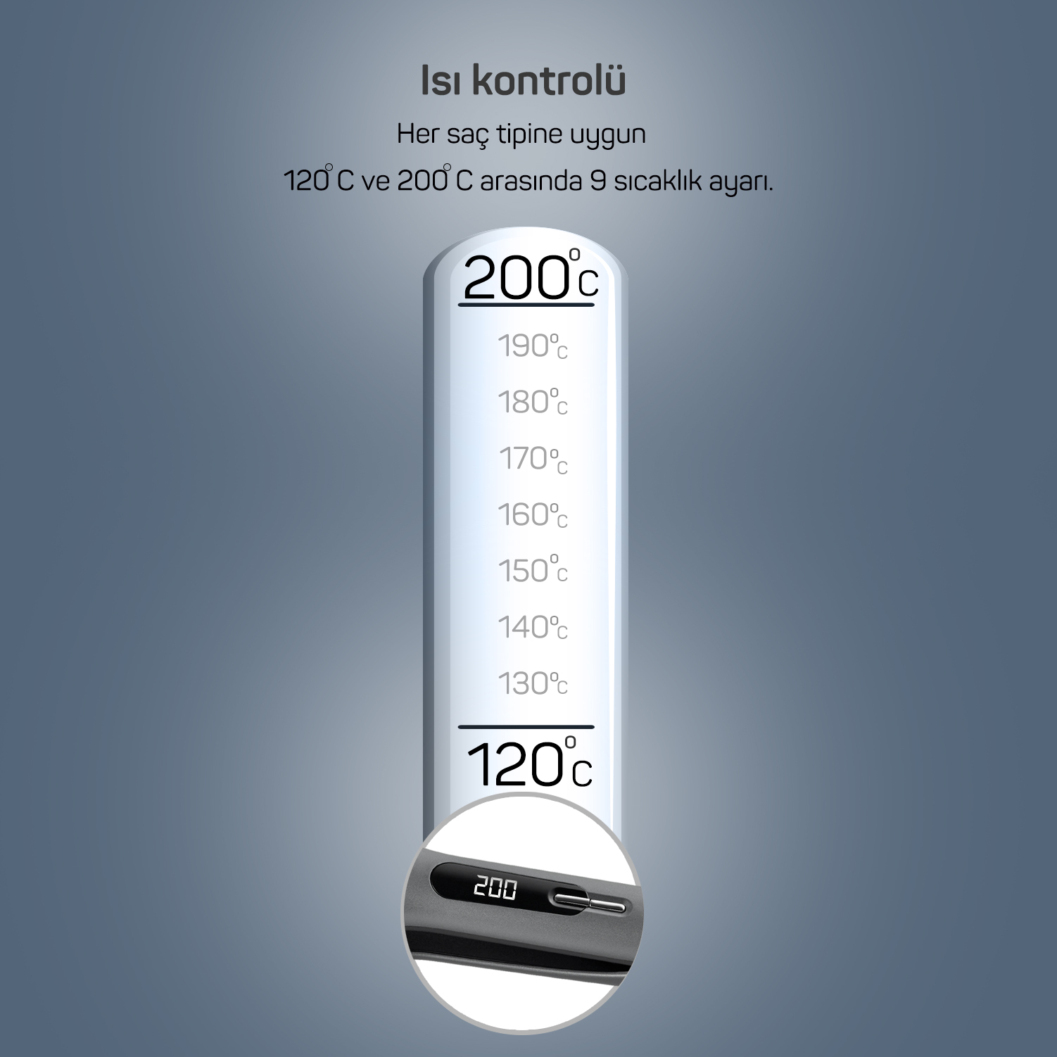 Her saç tipine uygun sıcaklık ayarı (120°C - 200°C) ile saçınız için en uygun sıcaklığı seçebilirsiniz. 200°C profesyonel sıcaklık ayarı sayesinde saçınızı kolayca şekillendirebilir ve ideal görünümü kolaylıkla elde edebilirsiniz.