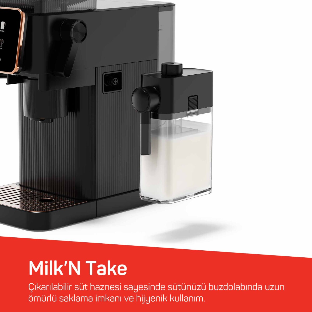 5.5” geniş ekranı sayesinde pratik kontrol imkanı sunarken, kompakt tasarımı ve 12 cm bardak uyumu ile mutfağınızda yer tasarrufu sağlar. Şık ve dayanıklı bir kullanım sunan cihaz, süt köpürtme özelliği ile kahve keyfinizi bir üst seviyeye taşır.