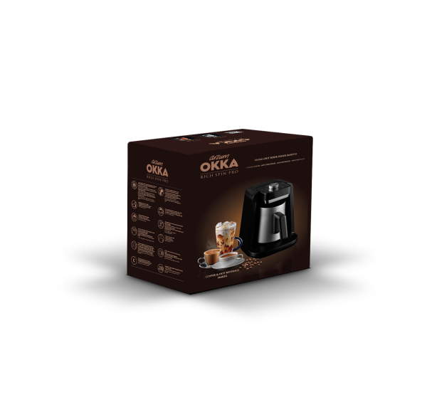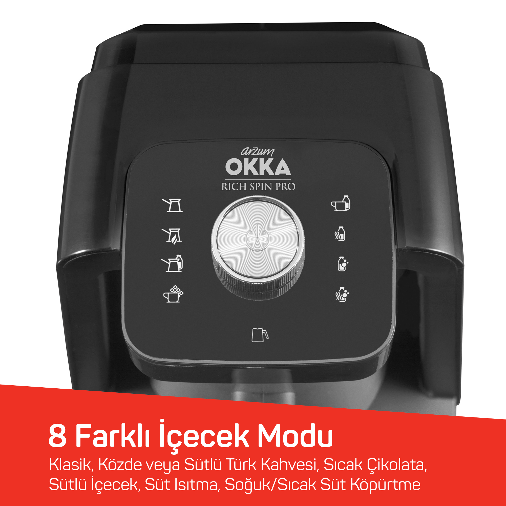 Personalize the traditional Turkish coffee pleasure with 8 different modes with OKKA Rich Spin Pro, Turkey's first Turkish coffee machine with a mixer and coffee pot and milk; prepare up to 5 cups of coffee with plenty of foam and perfect consistency at once.