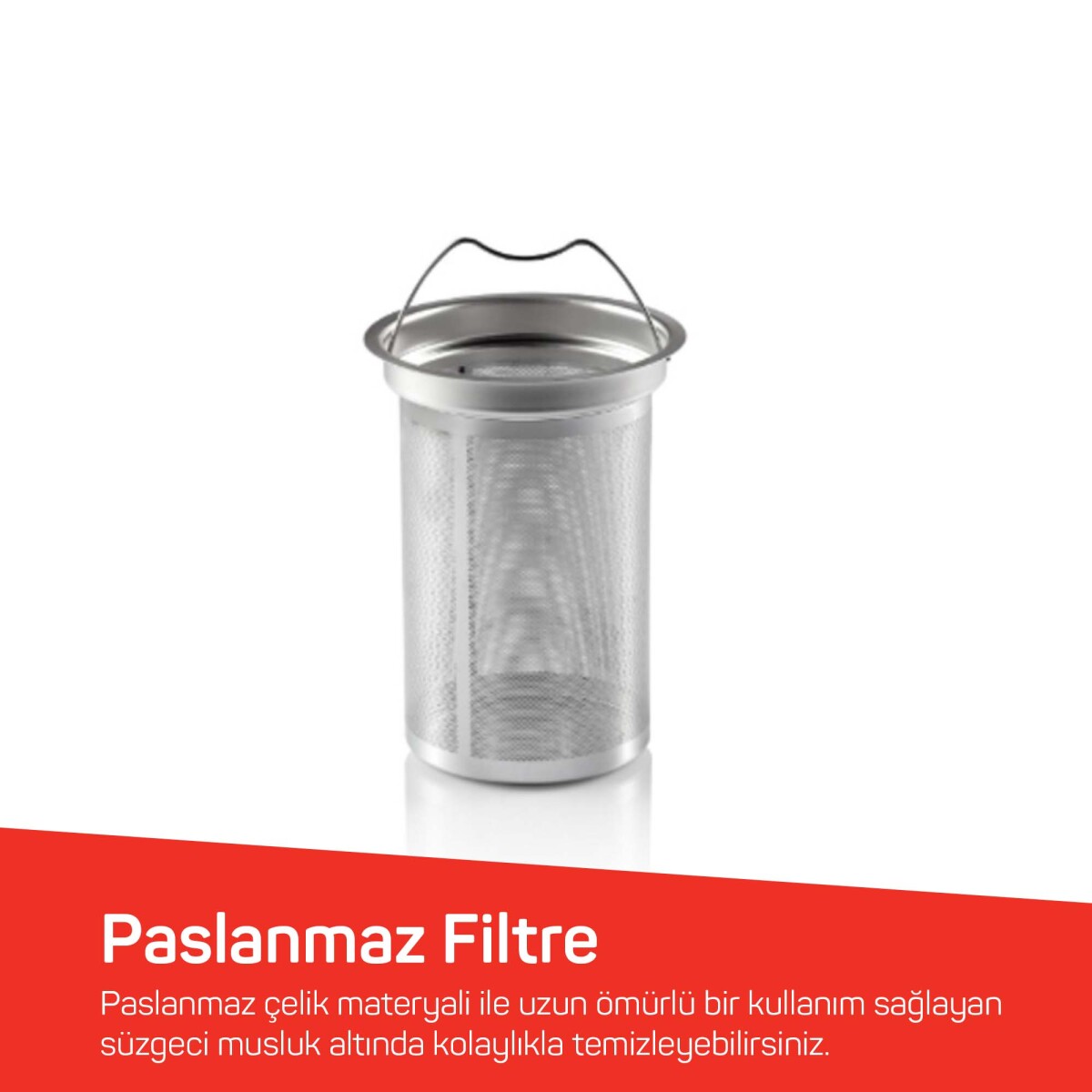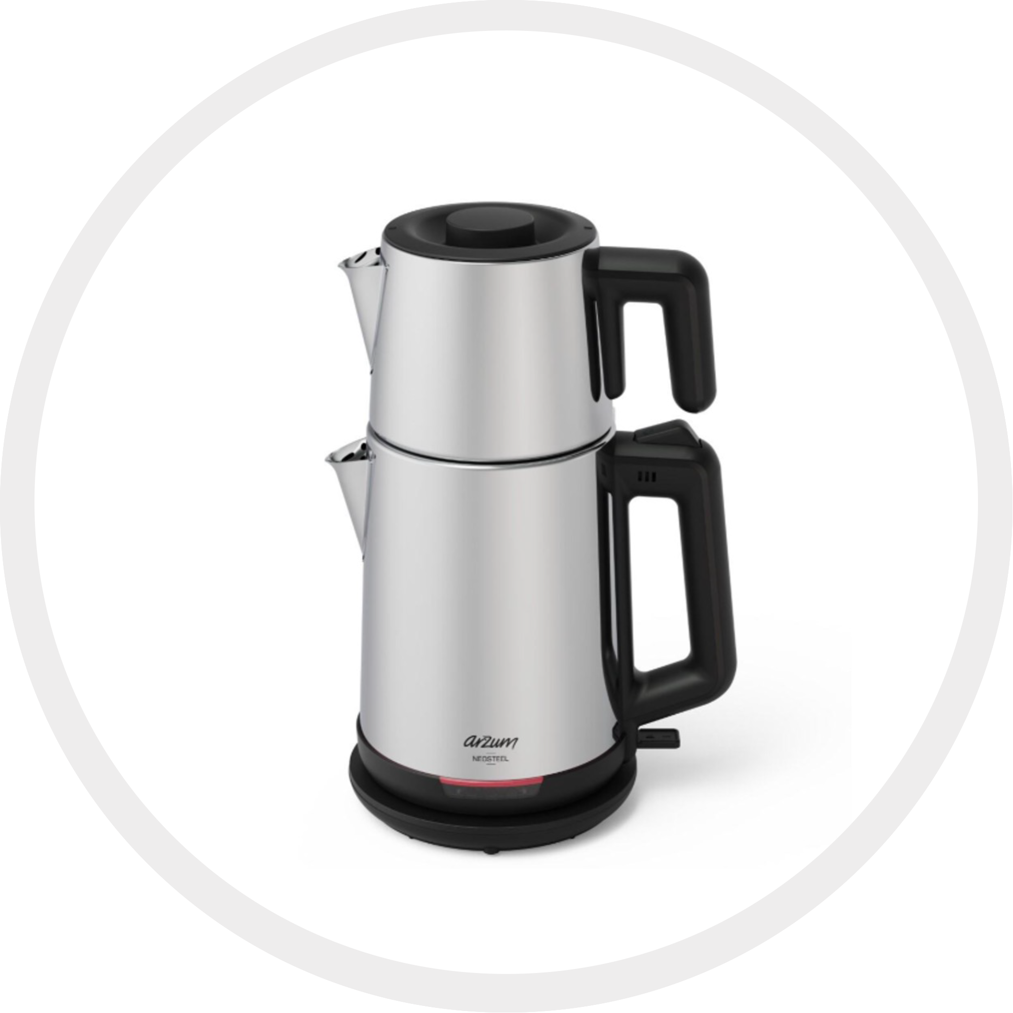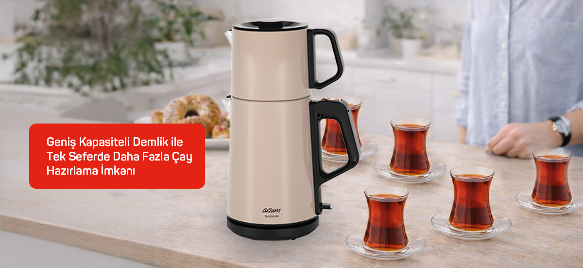 Arzum Teachem 1,8 L paslanmaz su ısıtıcı haznesi ve 1,2 L geniş kapasiteli ve sağlıklı çelik demliği ile tek seferde daha fazla çay hazırlama imkanı sunar